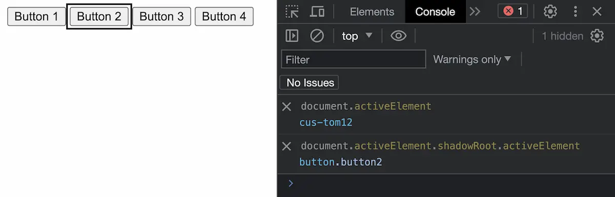 In the following demo, you can see how it says there are only three buttons on the page, but there are actually four. It's just that one is in the shadow DOM of the custom component. The click event handler attached to the document also only affects the buttons in the light DOM.